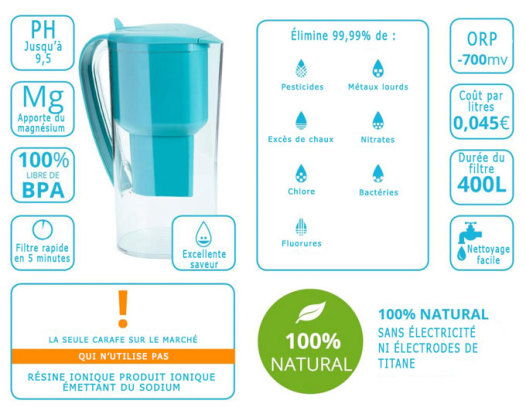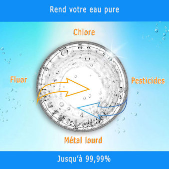 La technologie Alkamicronized Select® nous permet de filtrer 400 litres d’eau sans chlore, fluor, pesticides, nitrates, métaux lourds (plomb, mercure, cadmium, cuivre, aluminium et arsenic) et d’excès de chaux dans l’eau jusqu’à 99,99%.