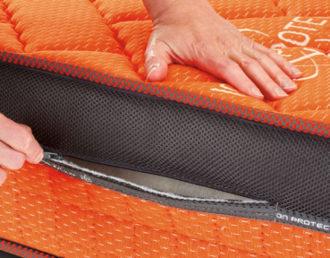 Une crémaillère est cousue sur un des côtés du matelas pour pouvoir observer le système « AIR CUSHION SYSTEM ». FARMAVISCO DE LUXE O3 Ion Protec emploie du matériel